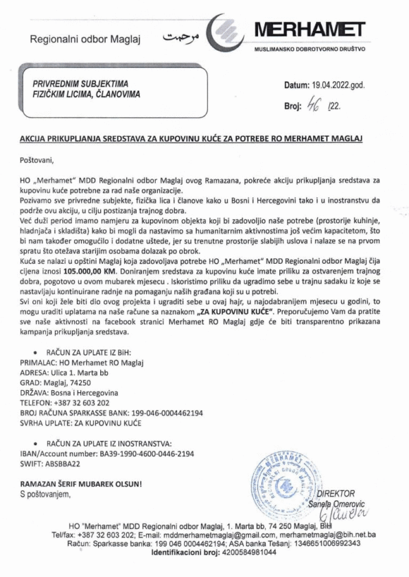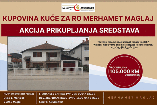 Ovim putem molimo sve one u Bosni i Hercegovini i dijaspori, koji imaju mogućnosti, da podrže našu akciju prikupljanja sredstava za kupovinu kuće, kako bismo obezbijedili bolje uslove za rad “Merhameta” u Maglaju, a samim tim, i za kvalitetniju brigu o socijalno ugroženim građanima na području općine Maglaj. Takođe, molimo Bosance i Hercegovce u našoj zemlji i dijaspori da ovu našu akciju promoviraju putem društvenih mreža kako bi vijest o njoj došla do što više ljudi u zemlji i inozemstvu – poručila je Sanela Omerović.