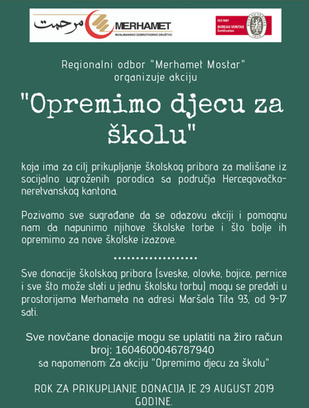 MOSTAR, 20. avgust – Regionalni odbor “Merhameta” Mostar organizuje akciju “Opremimo djecu za školu”, koja ima za cilj prikupljanje školskog pribora za mališane iz socijalno ugroženih porodica sa područja Hercegovačko-neretvanskog kantona (HNK).