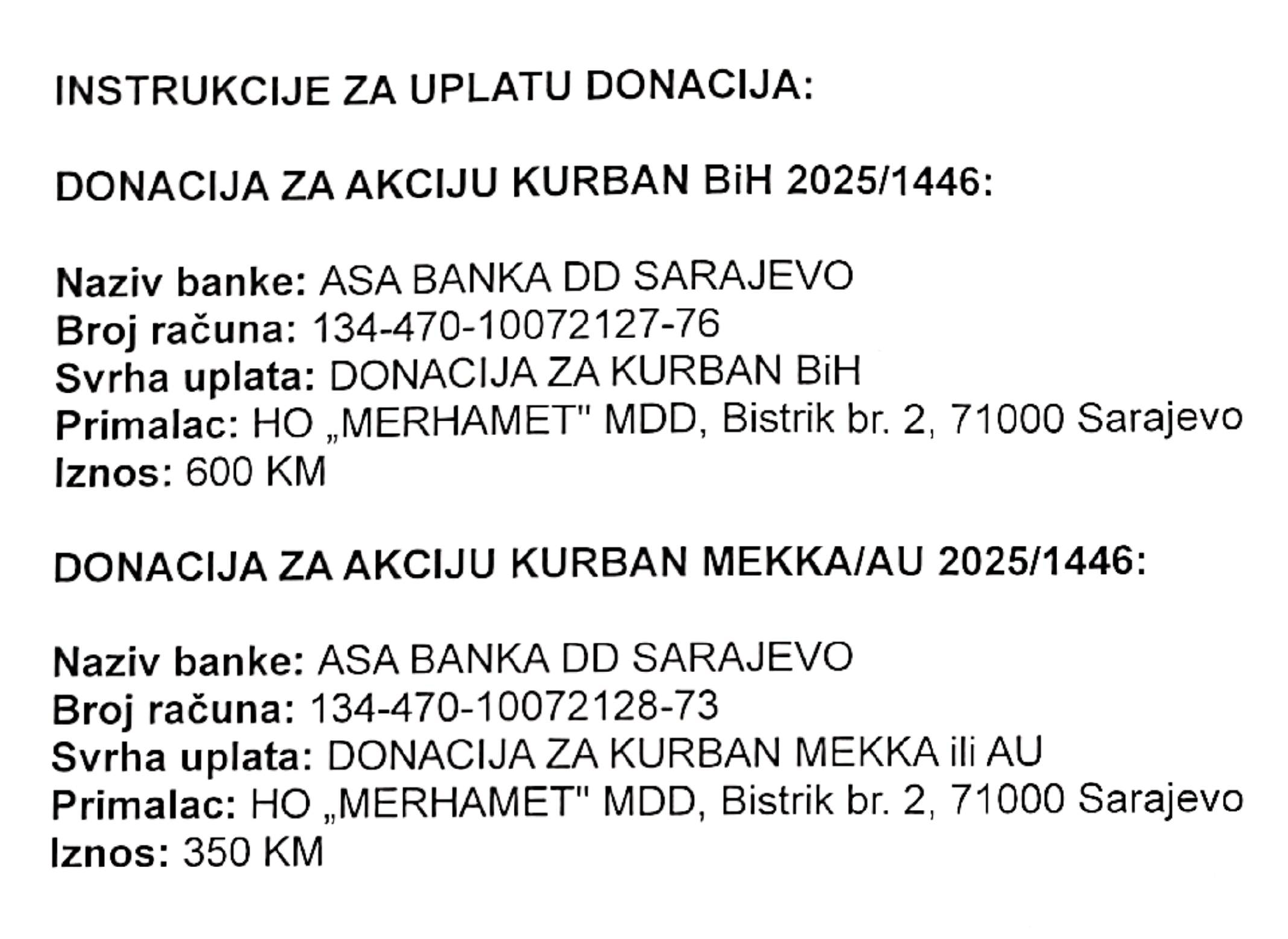 Donacije za nabavku domaćih kurbana i kurbana iz Mekke i Australije se primaju u svim „Merhametovim“ regionalnim i osnovnim odborima te u sjedištu Društva u Sarajevu (Bistrik 2).