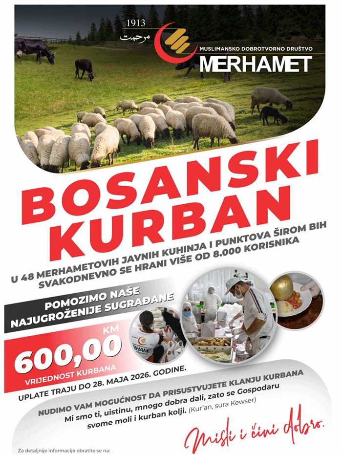 Počela je akcija „BOSANSKI KURBAN“ Muslimanskog dobrotvornog društva “Merhamet” i trajat će do 28. maja 2026. godine. Kurbani će se nabavljati od domaćih poljoprivrednih proizvođača i povratnika. I ove godine Merhamet " će primati i donacije za nabavku kurbana iz Mekke i Australije.